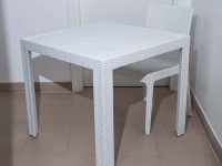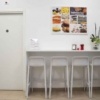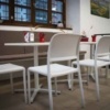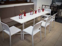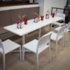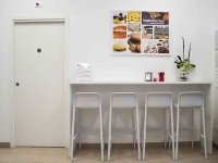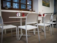 Per quanto riguarda il resto dell’arredo, invece, abbiamo ideato e fornito tramite i nostri partner tavoli e sedie in plastica bianca, che ricordano il candore della farina e il gusto delle cose essenziali, proprio come il pane. Per permettere anche a chi è di corsa di gustare i prodotti da forno offerti da “Semplicemente buono”, abbiamo inoltre realizzato un tavolo alto con sgabelli, mentre per chi vuole rilassarsi ammirando la piazza che si trova proprio fuori dal negozio, abbiamo fornito tavoli da esterno con una struttura in finto rattan che ricorda il legno intrecciato delle tavolate di campagna.
