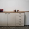 Inoltre, il mobile archivio è stato realizzato per sfruttare tutto lo spazio disponibile senza essere di intralcio, come si può notare dai ripiani più stretti in concomitanza della porta che rendono agevole il passaggio senza rinunciare ad uno spazio da dedicare alla cancelleria.
